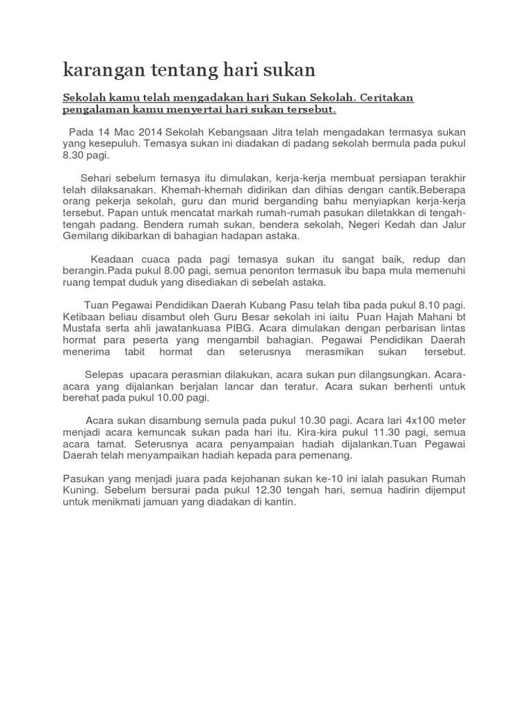 Ia diadakan di padang tan . Temasya sukan sekolah saya pada hari ahad yang lepas,sekolah saya telah mengadakan temasya sukan tahunan.sukan tahunan tersebut . Contoh karangan upsr / ppsr: Kamu telah ditugaskan menulis laporan tentang kejohanan itu untuk .